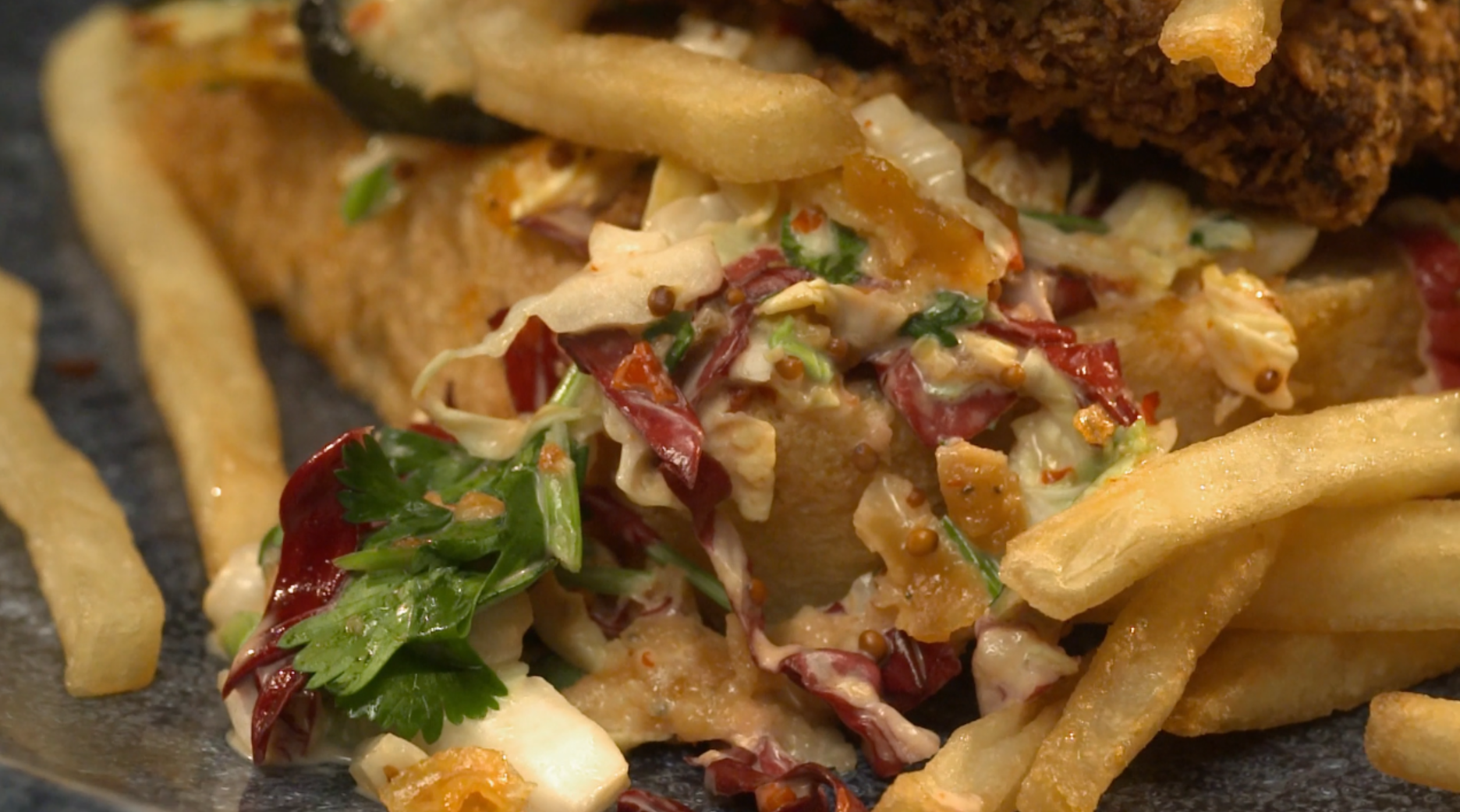 Chicken Katsu Sandwich: panko-crusted chicken thigh, bulldog mayo, cabbage slaw, scallion, cilantro, dill pickle vinaigrette, buttery TX toast